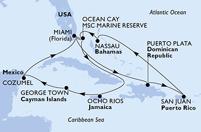 Cruises to Ocean Cay with MSC Cruises depart from three main ports - Miami, Port Canaveral (Orlando) and New York - all of which hold their own appeal. As Miami is MSC Cruises' main embarkation port for the Bahamas and Caribbean journeys, a Bahamas cruise from Miami to Ocean Cay can include stops at many other fantastic places. These include the Bahamas' capital, Nassau, Puerto Plata in the Dominican Republic, San Juan in Puerto Rico and lots more.