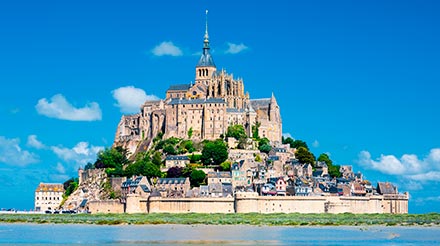 Mont-Saint-Michel rises majestically from the sea, surrounded by low tide and a vibrant sky | MSC Cruises